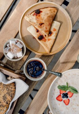 На завтрак пекут блинчики и готовят кашу, делают омлет и бутерброды, угощают фруктами и варят ароматный кофе.