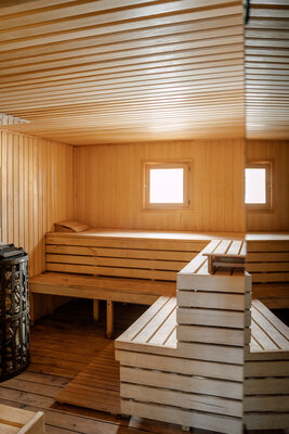 Парилка на 4-6 гостей, душевая и чайная комната с панорамным видом на заповедный лес.