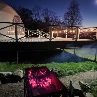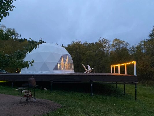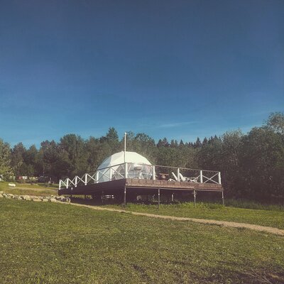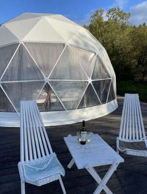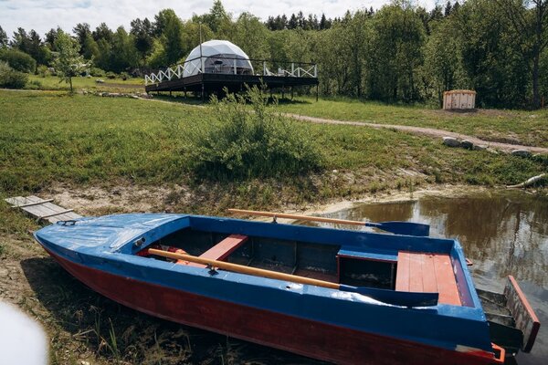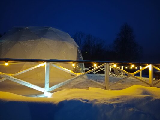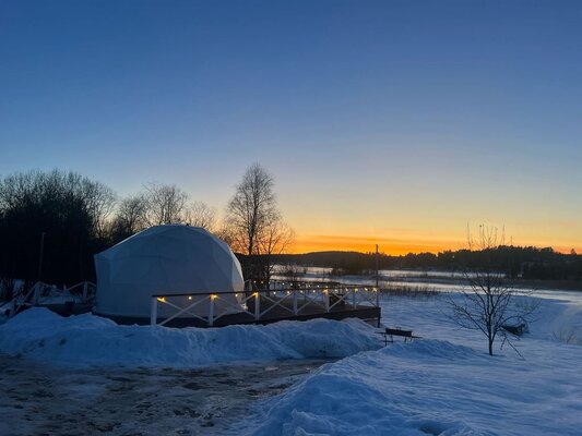 На просторной террасе возле купола установлены столики и стулья для приятных обедов с видом на озеро, а в зоне барбекю с мангалом вы сможете приготовить вкусные закуски. Дополнительно предусмотрена дровяная баня и приватный пирс, где можно попробовать рыбачить. Для освежения и моментов релакса в озере предусмотрена зона купания, а также маршруты для живописных лесных прогулок.