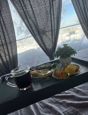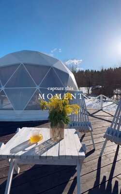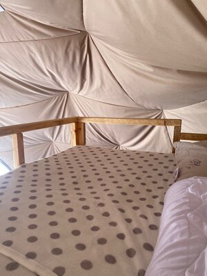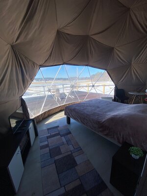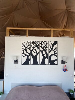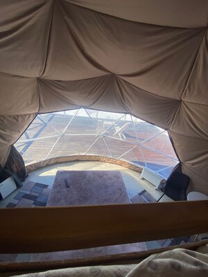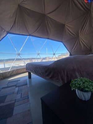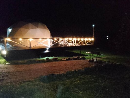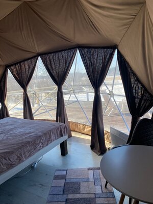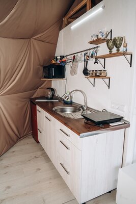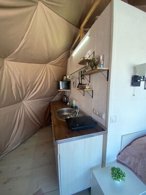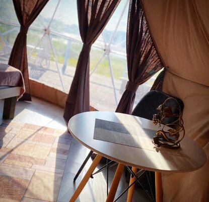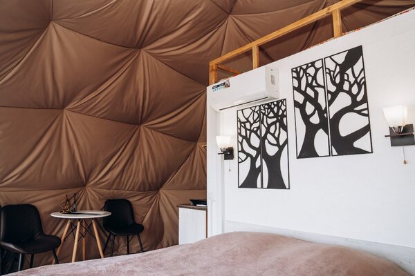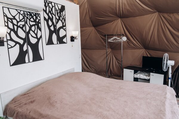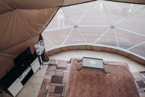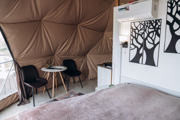 В вашем распоряжении уютный геодезический купол на 4 персоны, оснащенный всеми удобствами: санузел, мини-кухня, бытовая техника, кондиционер и стильная массивная мебель.