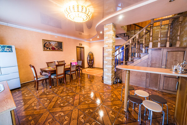 В вашем распоряжении – современная бытовая техника: вместительный холодильник для хранения продуктов, микроволновая печь для быстрого разогрева, удобная варочная панель для приготовления горячих блюд, электрический чайник для чаепития и мощная вытяжка для удаления неприятных запахов. Кухня полностью укомплектована необходимой посудой и столовыми приборами, позволяющими с комфортом готовить и принимать пищу. Гостиная зона, оформленная в уютном стиле, оснащена мягкой мебелью, включая три комфортабельных двухспальных дивана, идеально подходящих для отдыха после активного катания на лыжах. На первом этаже также находится один из трёх санузлов, оборудованный современной душевой кабиной. Второй этаж коттеджа занимает приватную зону, где расположены две изолированные спальни. Каждая спальня оснащена большой двуспальной кроватью с ортопедическим матрасом, обеспечивающим здоровый и комфортный сон.