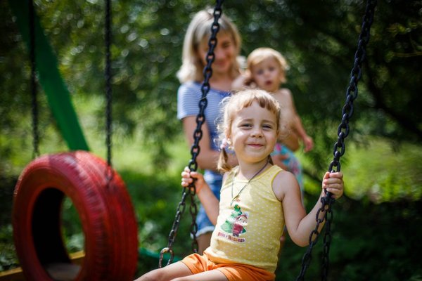 Качели и песочница.