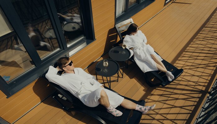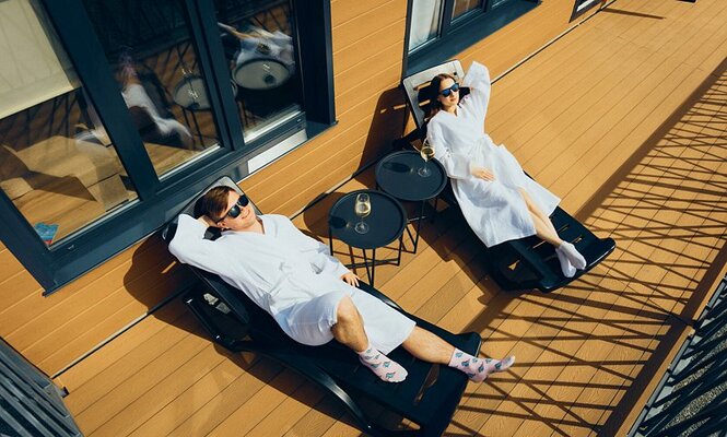 Собственная терраса 22м² оборудована шезлонгами, столом и стульями.