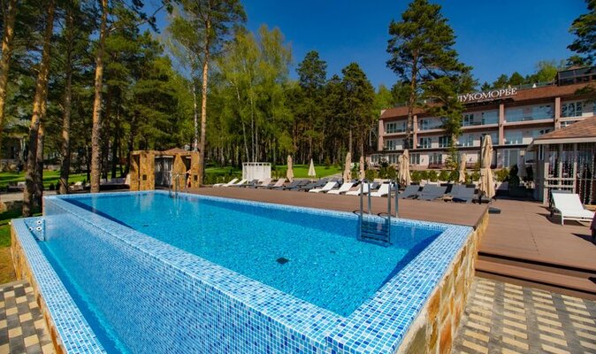 Ресторан «Лукоморье» расположен в основном здание отеля, окутан атмосферой «lounge» стиля, который создает уютную и расслабляющую обстановку. Из окон ресторана открывается великолепный вид на лес и террасу, что придает ему изысканный шарм. Вместительный зал ресторана позволяет принимать большое количество гостей, что делает его идеальным местом для проведения свадебных и корпоративных банкетов, детских праздников или просто дружеских вечеринок. Ресторан «Лукоморье» предлагает 50 уютных мест для посадки гостей.
