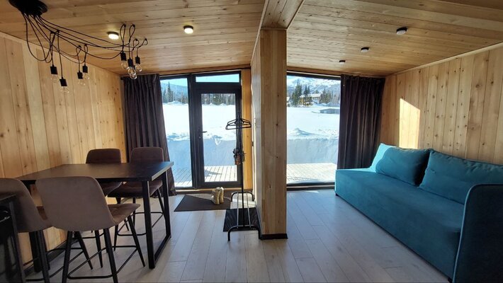 Уютный и стильный коттедж «Модуль 1» расположен в поселке Шерегеш в Кемеровской области.
