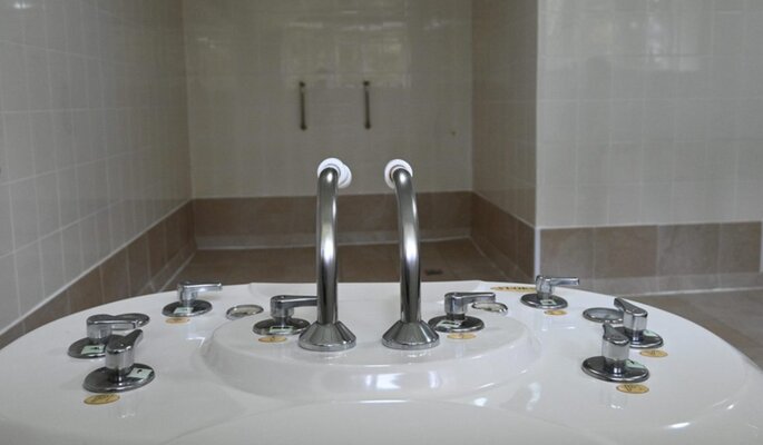 На территории санатория, отдельно стоящим зданием возвышается банный комплекс.