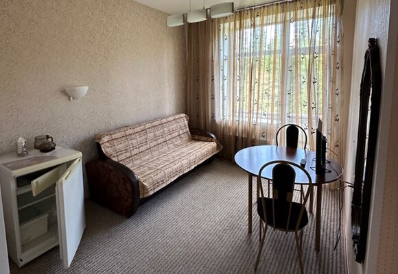 Санаторий представляет собой 3-этажное здание с просторными холлами, оборудованными зонами отдыха, настольными играми и телевизором. На первом этаже расположены медицинский центр, столовая и фитобар.
