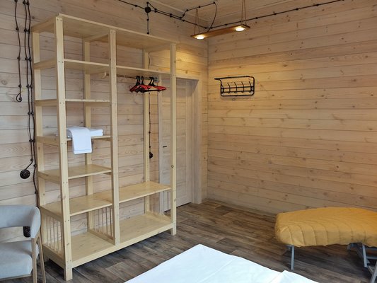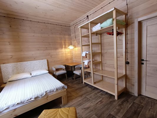 Первый этаж включает просторную гостиную и кухню, оформленные в студийном стиле и площадью 48 квадратных метров, а также отдельную изолированную комнату, где живут хозяева.