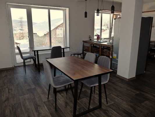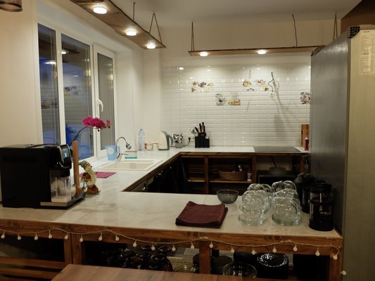 К удобству гостей большая гостиная и кухня. На кухне есть все необходимое для приготовления еды, в том числе на большую компанию. Кухонная утварь — кастрюли и сковороды, ножи, столовые приборы, тарелки, кружки, салатники, посуда для спиртных напитков и прочее необходимые предметы для организации ужина компании. Есть вместительный холодильник, плита, посудомоечная машина, электрочайник, микроволновка, кофемашина.