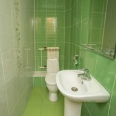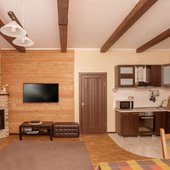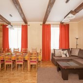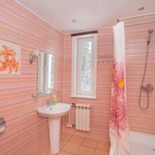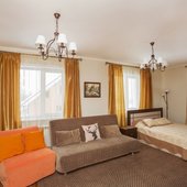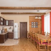 На первом этаже расположена просторная гостиная с большим столом для дружной компании, кухонный уголок с посудомоечной машиной, полным набором хорошей посуды и столовых принадлежностей.