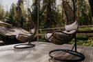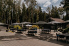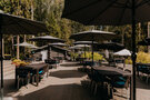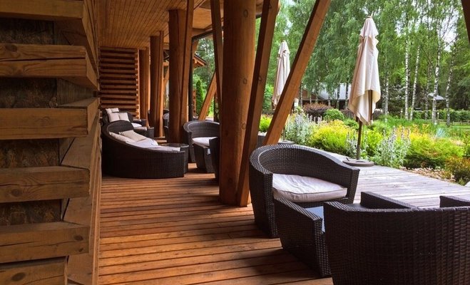Отдыхающие могут укрыться зонтиками от палящего солнца или наоборот, нежиться под его лучами, а если настигла непогода — уникальная и единственная в костромской области стеклянная сауна с видом на реликтовый лес — всегда в их распоряжении. Открытый бассейн работает при температуре воздуха до -15 градусов.