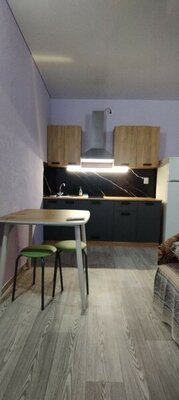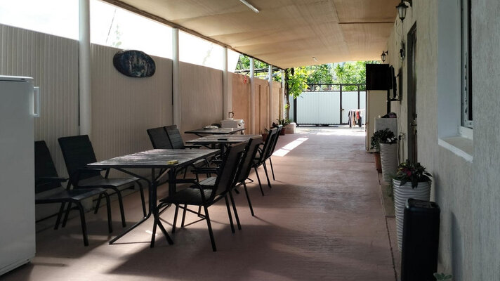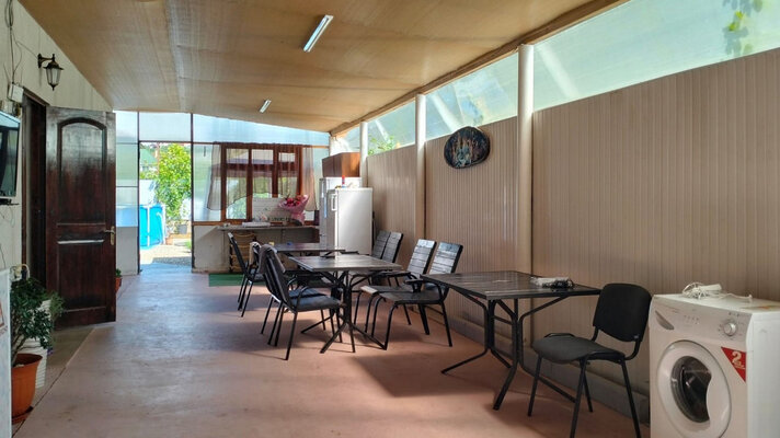 На веранде гостевого дома, защищенной от непогоды стенами и навесом, расположена оборудованная кухня, где гости могут с комфортом приготовить любимые блюда. Здесь можно расположиться за одним из столиков и насладиться трапезой, наслаждаясь отдыхом и спокойствием.