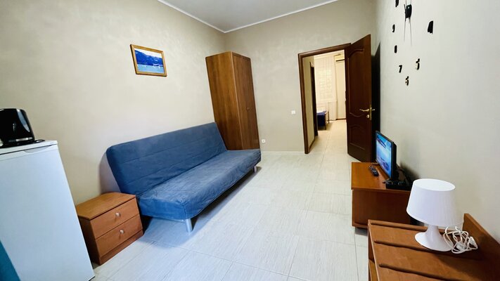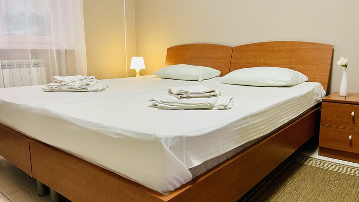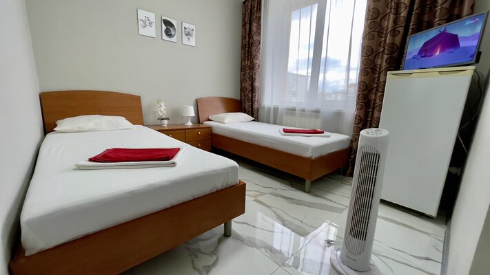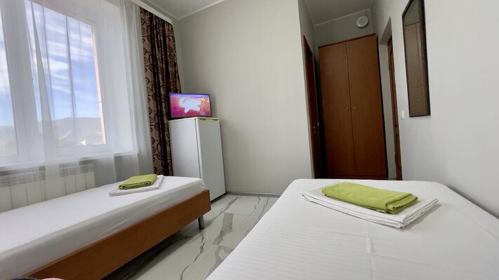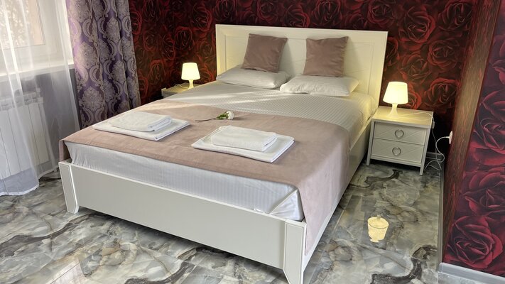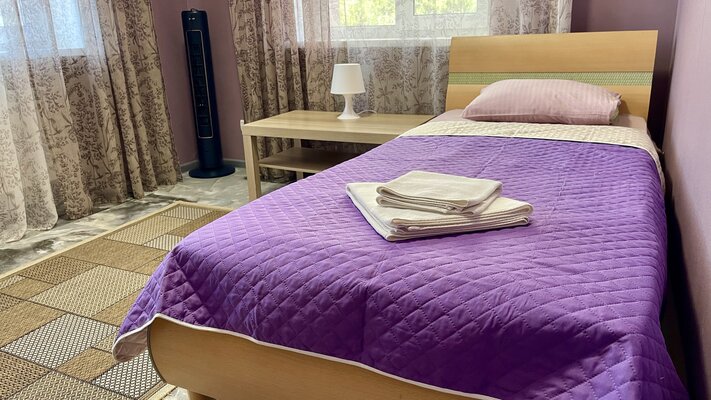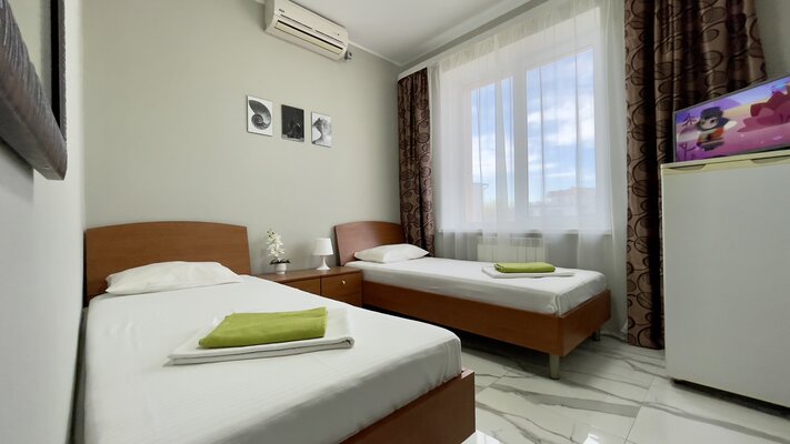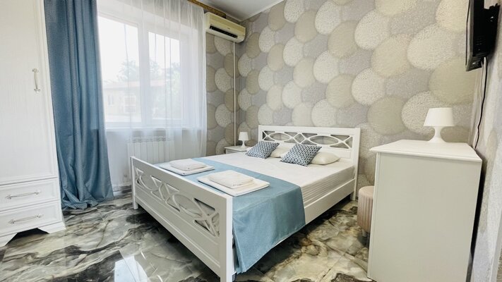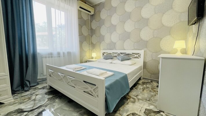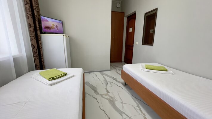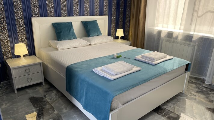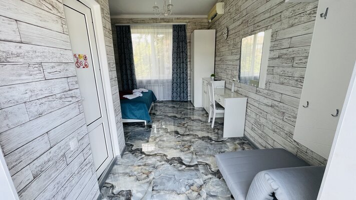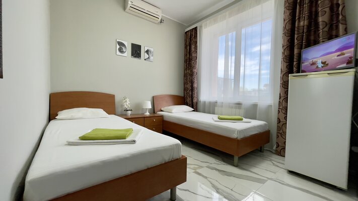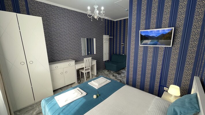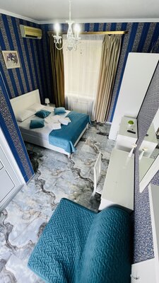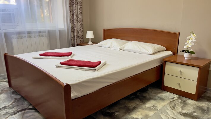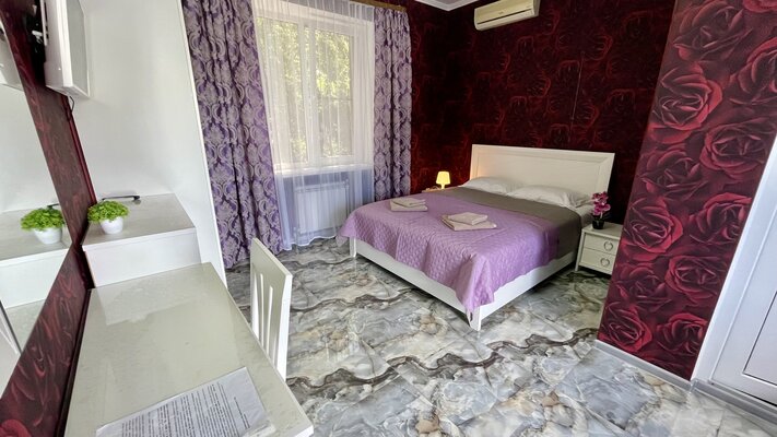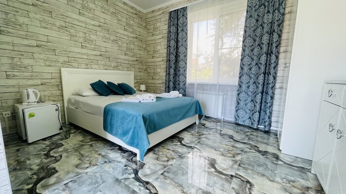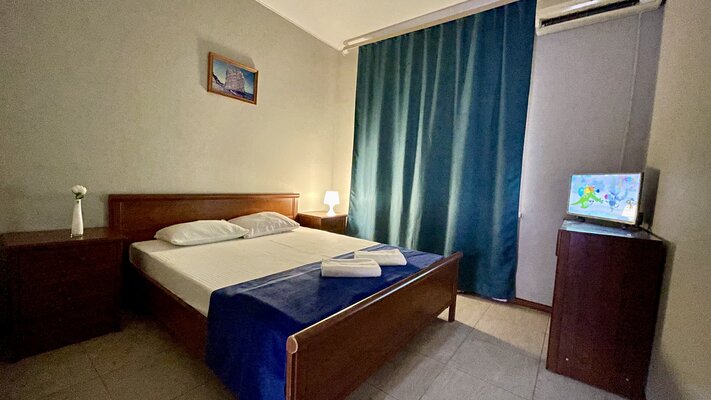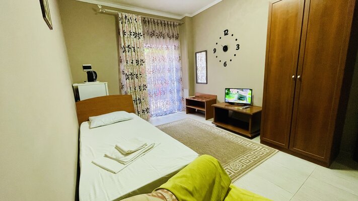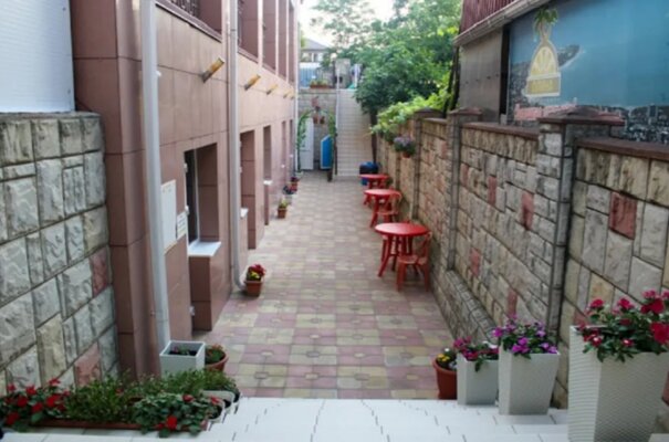 Сам гостевой дом находится в тихом, зеленом квартале среди жилой застройки, обеспечивая спокойный отдых. К услугам гостей предлагаются комфортабельные однокомнатные и двухкомнатные номера различных категорий. В каждом номере предусмотрен собственный санузел с душем, кондиционер, телевизор и мини-холодильник.