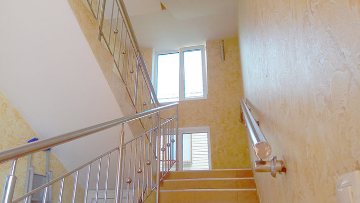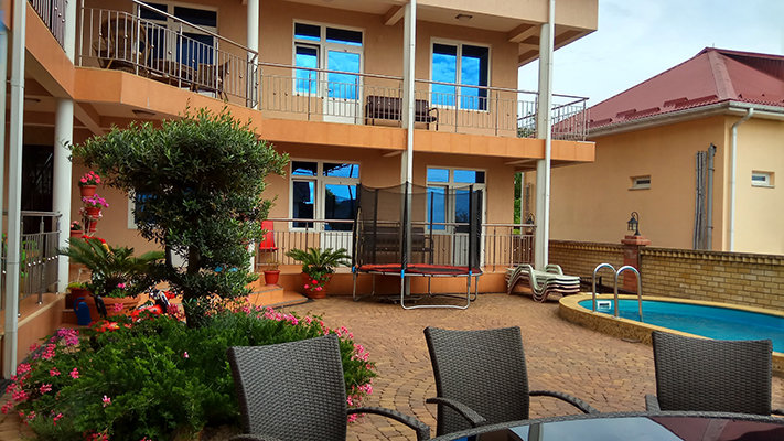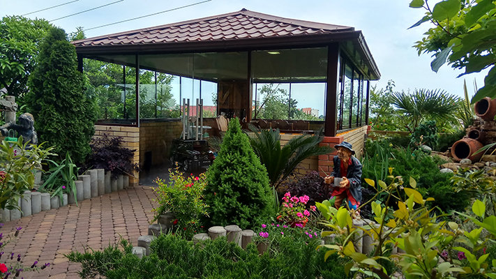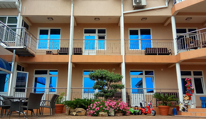 На собственной территории у моря трехэтажный гостевой дом предлагает комфортабельный отдых в номерах с защищенными от солнца панорамными окнами.