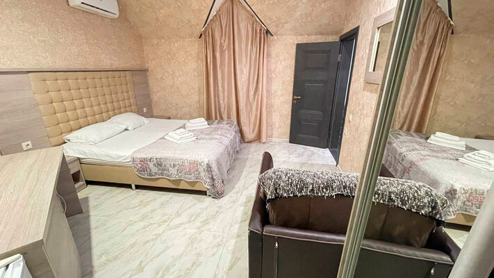 Самолетом до аэропорта Адлер, далее автобусом№535,557 в направлении «Вокзал Олимпийский парк» до остановки «Торговый Центр Новый век», далее пройти 269 м до гостевого дома.