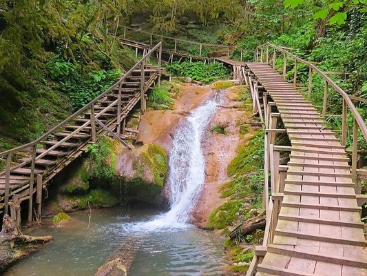 По другую сторону раскинулось чарующее своей красотой ущелье. При любой жаре его не покидает бодрящая прохлада, исходящая от речки, красивых водопадов и чудесной природы. Очень подходит для пешеходных экскурсий, с оборудованными для пикников местами. Отличное место для отдыха тех, кто хочет тишины, природы, умиротворения и отдыха для глаз и души. Улочка тихая и короткая, начинается храмом (с очень ухоженной территорией) и уходит в горы и ущелье, весьма живописное.