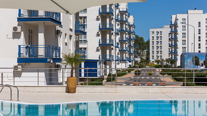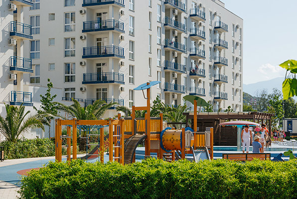 Территория «Альфа Сириус» окружена пышной зеленью и благоустроена всем необходимым для идеального отдыха: здесь предусмотрены комфортные зоны для релаксации и современные детские игровые площадки.