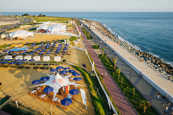 В десяти минутах езды от отеля расположено три оборудованных пляжных комплекса для гостей курорта. Посещение пляжа бесплатное, аренда шезлонгов, зонтиков и бунгало за дополнительную плату. За безопасность на берегу отвечают квалифицированные спасатели, есть медицинский пункт. К услугам гостей на пляже: спортплощадка, детская игровая комната, бары, сапборды, экскурсии, курортные товары, бьюти-услуги (плетение косичек/временное тату), SPA-услуги, пуфы в вечернее время, качели, мороженое. В летний период от отеля курсирует бесплатный трансфер на пляж. В зимний период полноценно работает пляж «Гамма Сириус», к услугам гостей: бар, сап станция (выдаются гидрокостюмы), фотозона, пуфы, экскурсии. Работает охрана, медики и спасатели. На пляжах «Сигма Сириус» и «Сириус» гости могут расположиться на мягких пуфах.