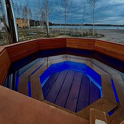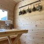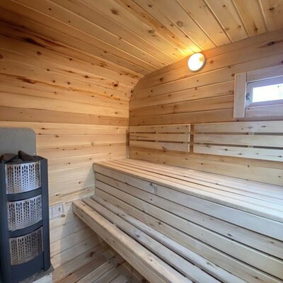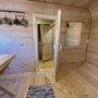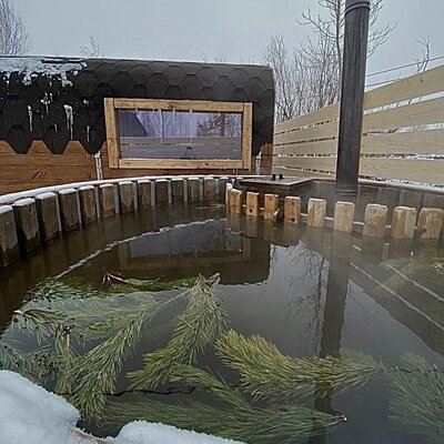 Это баня-бочка 2,2 метра в диаметре, длина 5 м, рассчитана для комфортного отдыха 4 человек, максимальная вместимость 6 человек. Возле бани установлена теплая купель, которая входит в стоимость аренды бани.