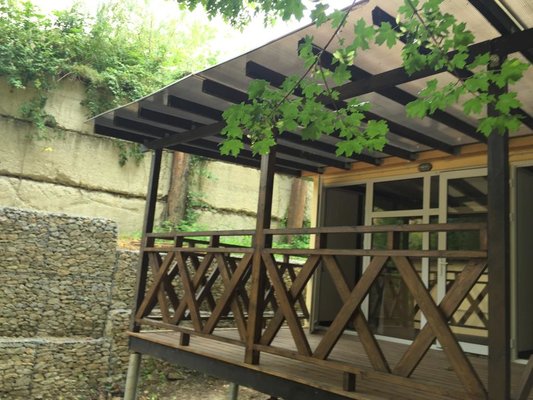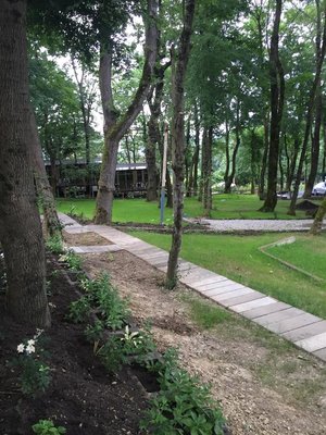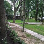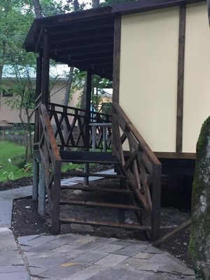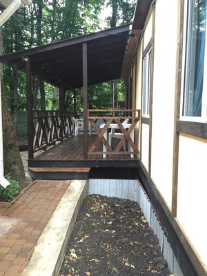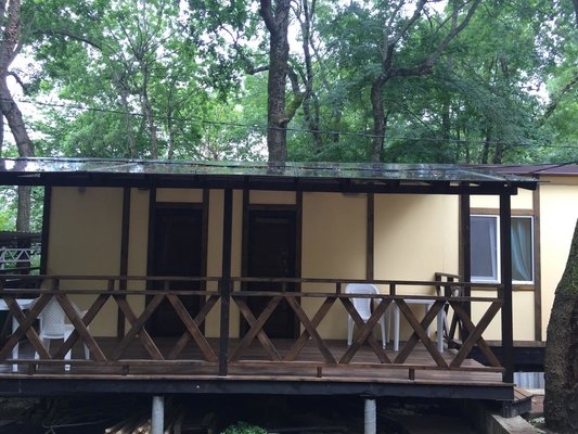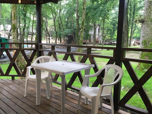 Большая тенистая территория.Очень много уделено внимания на озеленение ,коттеджи люкс.