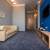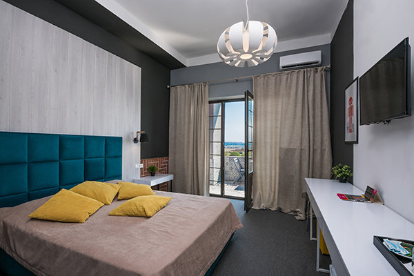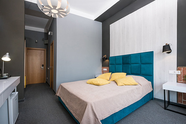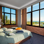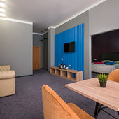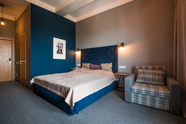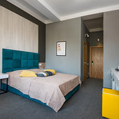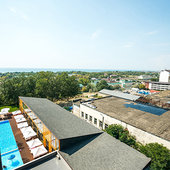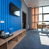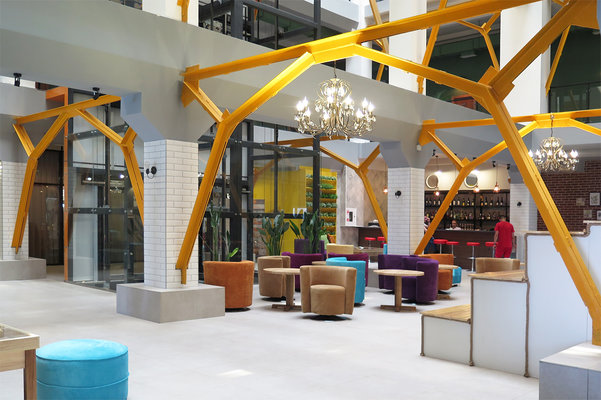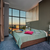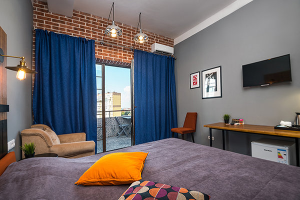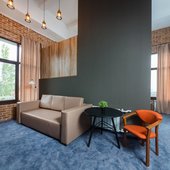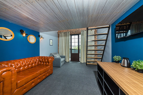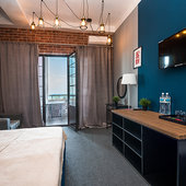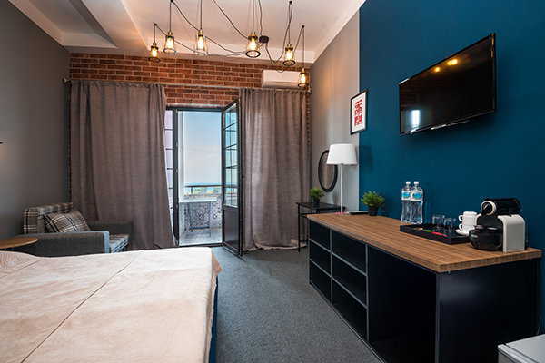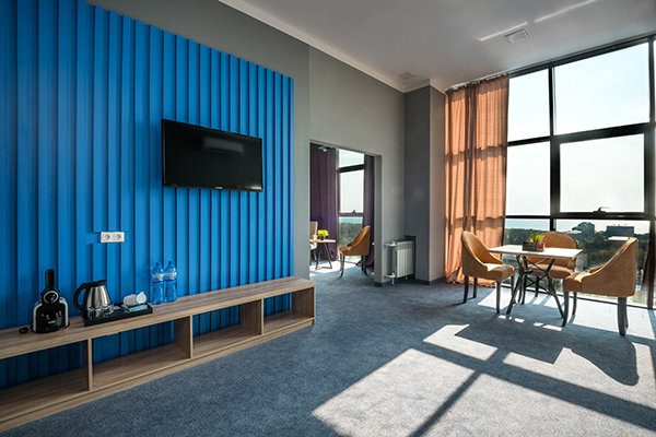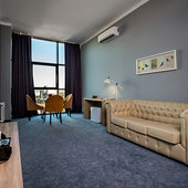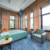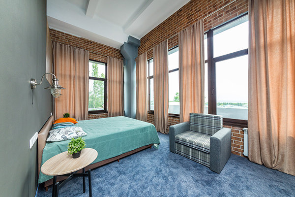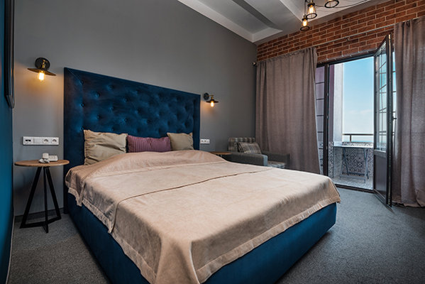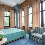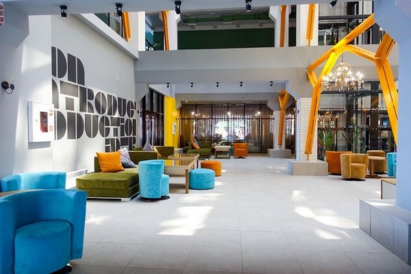 Главный восьмиэтажный корпус – это бывшая советская фабрика, которую в 2016 году команда дизайнеров превратила в ультрасовременный отель в стиле Лофт. Здесь 173 номера, шведский стол, spa-комплекс с бассейном, кинозал, детские комнаты и тренажёрный зал. На восьмом этаже корпуса – панорамный ресторан BRUT8. А в зоне отдыха – открытый бассейн и бар.