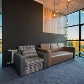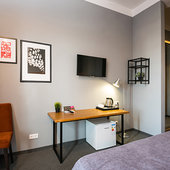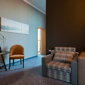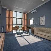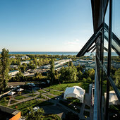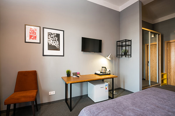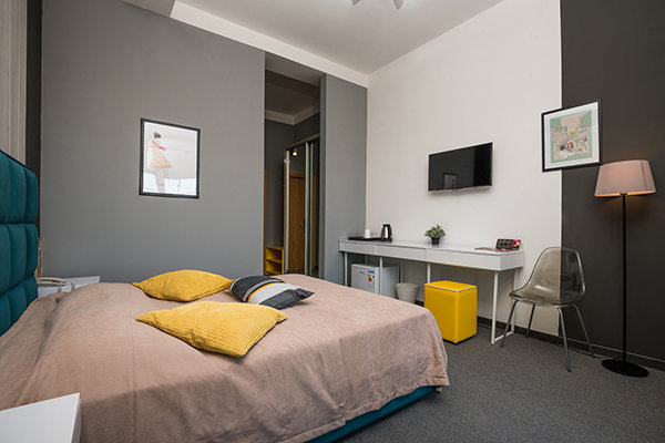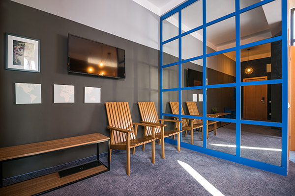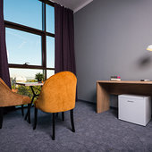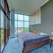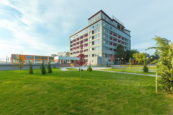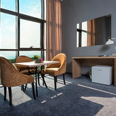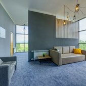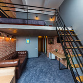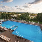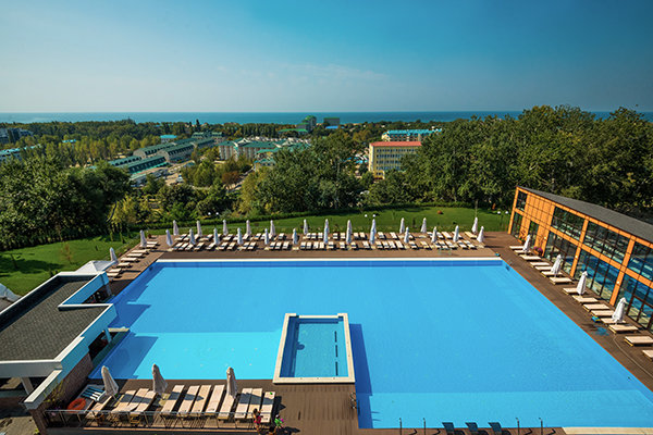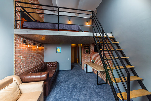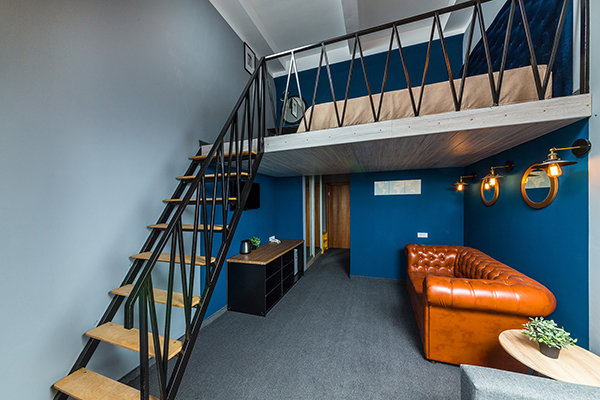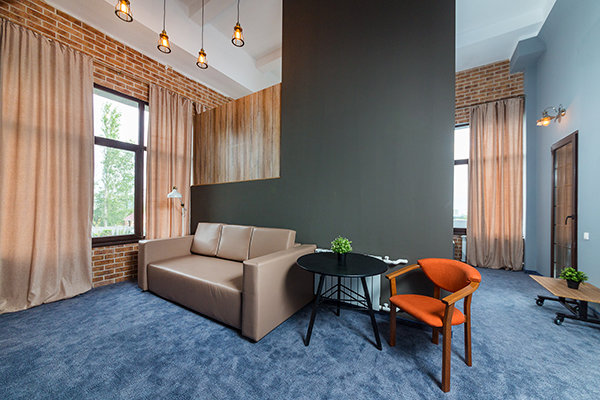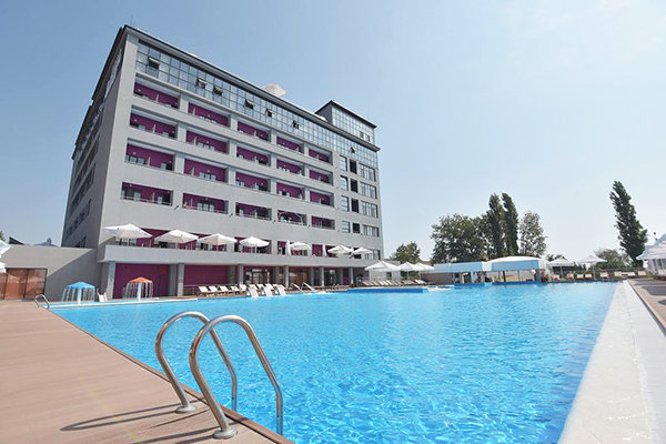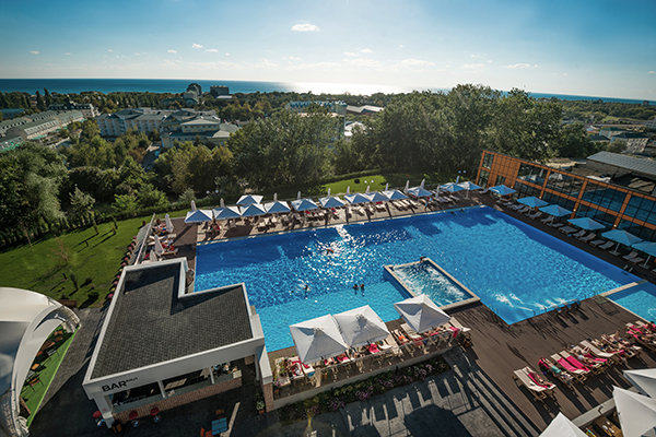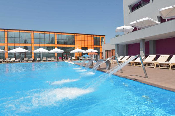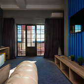 Главный восьмиэтажный корпус – это бывшая советская фабрика, которую в 2016 году команда дизайнеров превратила в ультрасовременный отель в стиле Лофт. Здесь 173 номера, шведский стол, spa-комплекс с бассейном, кинозал, детские комнаты и тренажёрный зал. На восьмом этаже корпуса – панорамный ресторан BRUT8. А в зоне отдыха – открытый бассейн и бар.
