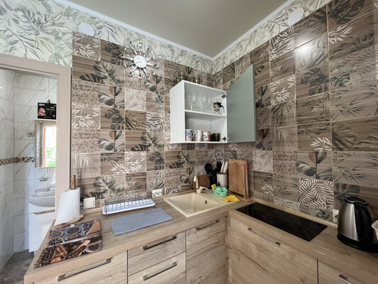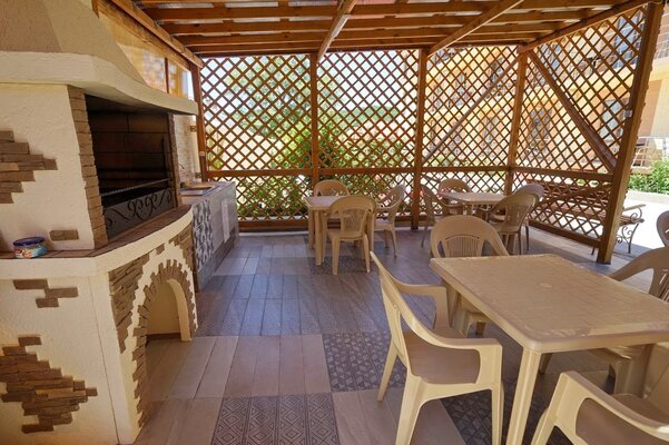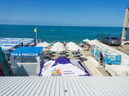 В паре минут ходьбы расположен обустроенный галечный пляж, где есть раздевалки, навесы, лежаки и водные развлечения.