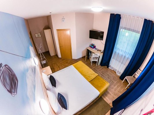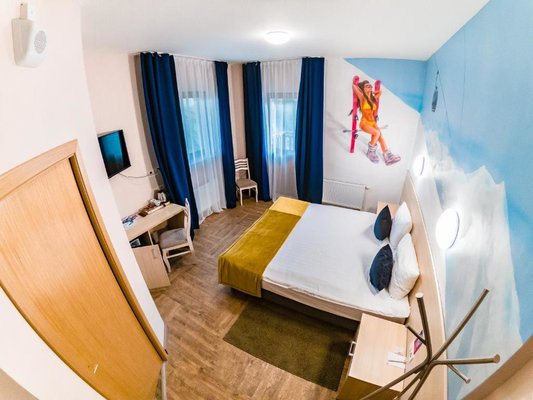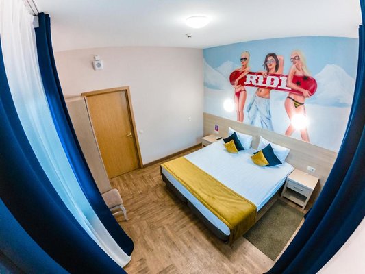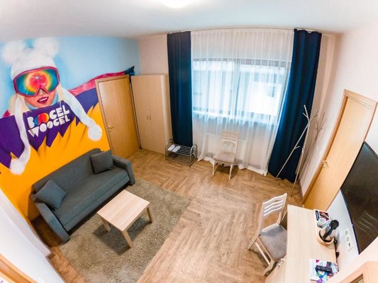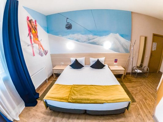 Номера отеля оформлены в стиле высокогорного карнавала BoogelWoogel, который впервые прошел на курорте Роза Хутор в апреле 2016 года и дважды вошел в книгу рекордов Гиннесса. Из номеров открывается вид на горы. На первом этаже отеля находится бар.