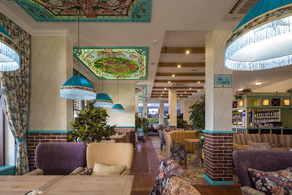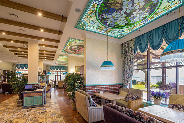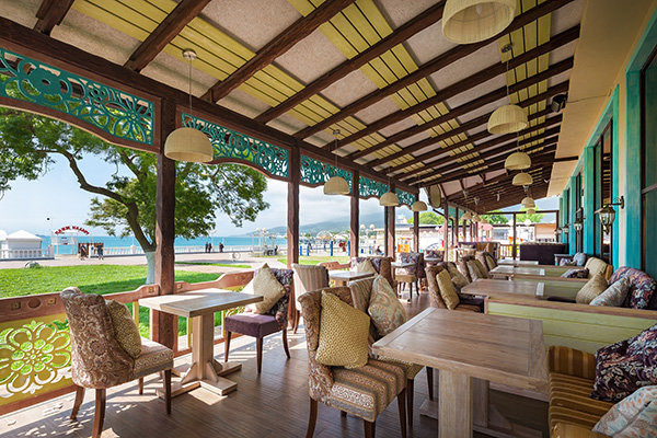 Кафе — в здании отеля на 1 этаже; кухня- европейская; часы работы: летний сезон 8:00-01:00; зимний сезон 11:00-01:00