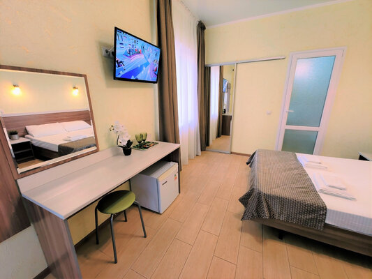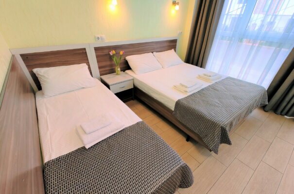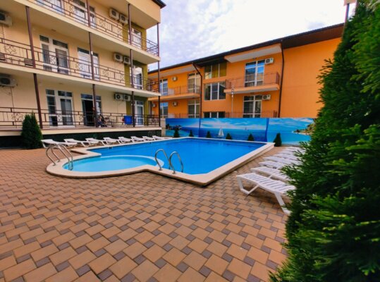 Поездом до ж/д вокзала г. Анапа, далее на маршрутном такси №120 до остановки «Юбилейный», далее пройти 890 м пешком до отеля.