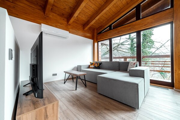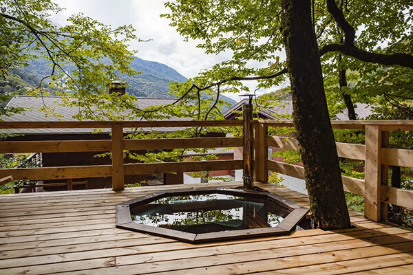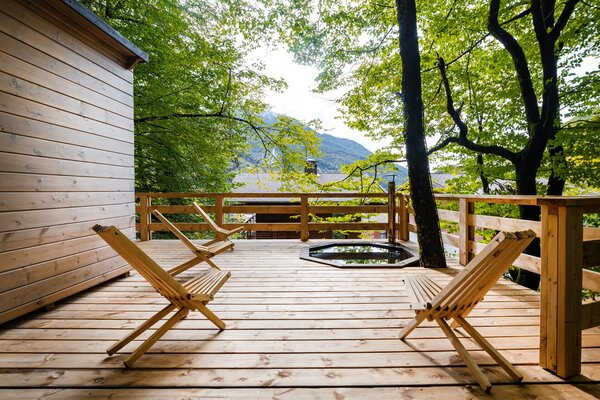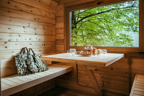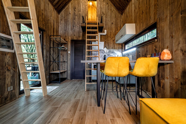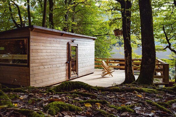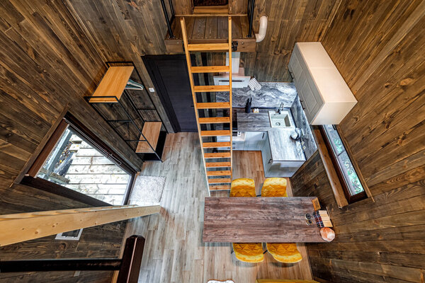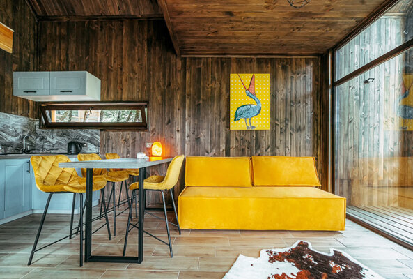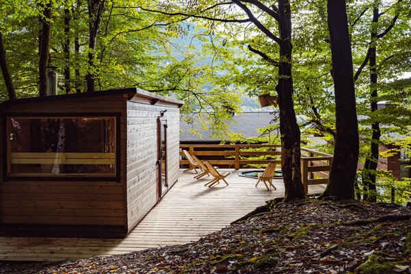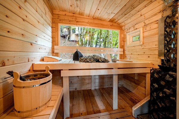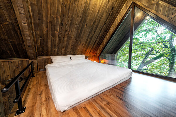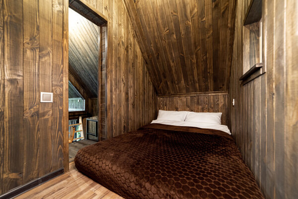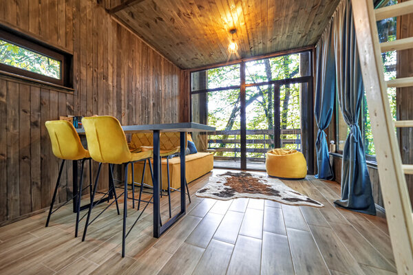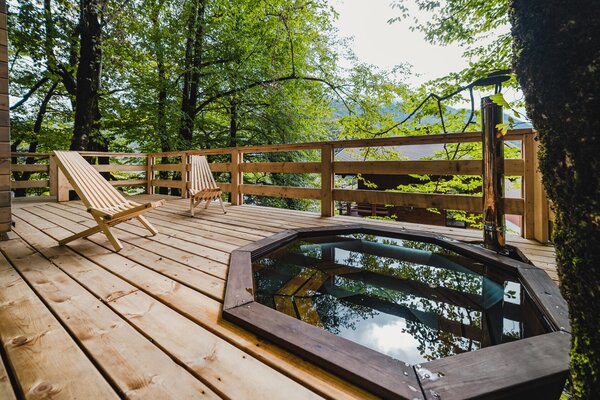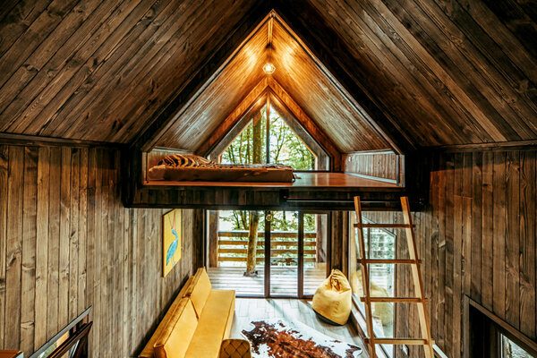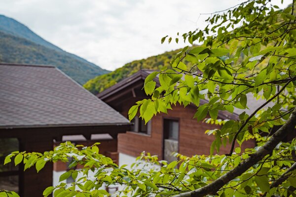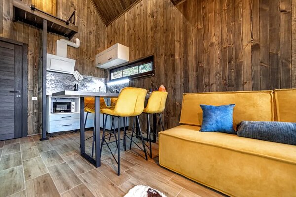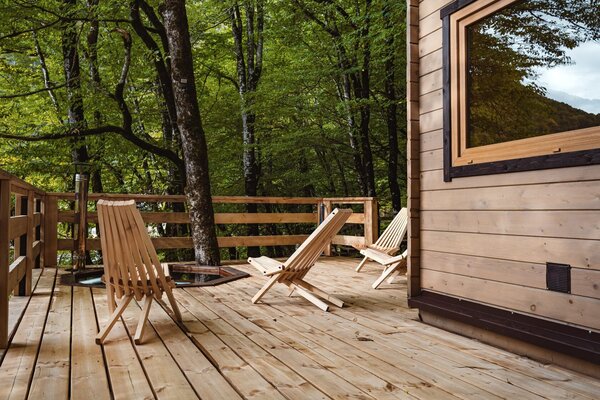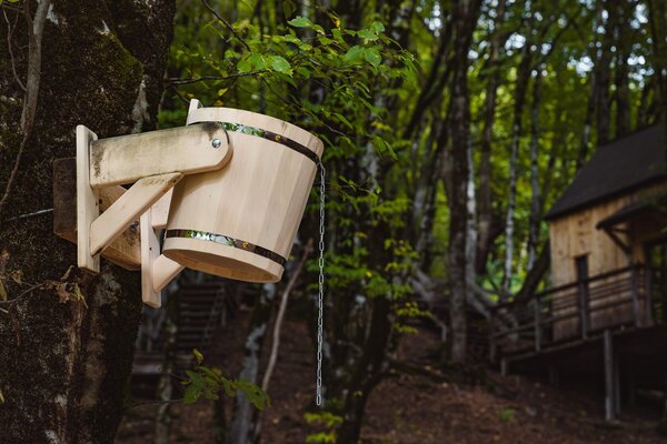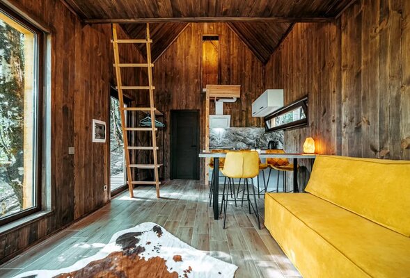 На склоне леса гармонично размещены два деревянных домика на деревьях, выполненные в стиле глэмпинг. Каждый домик предлагает уникальные сюрпризы. Из окон открывается живописный вид на зелёный лес, а через листву проглядывают снежные вершины гор. Интерьер в стиле горной хижины наполнен уютными деталями. Домики оснащены всей необходимой мебелью, кухней и техникой для комфортного проживания.