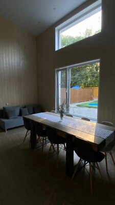 В доме есть три отдельные спальни, две ванные комнаты и просторная кухня-гостиная с современной техникой: посудомоечной машиной, холодильником, микроволновкой и кулером. Гостям доступны Wi-Fi, телевизор, кондиционер, а также настольные и активные игры.