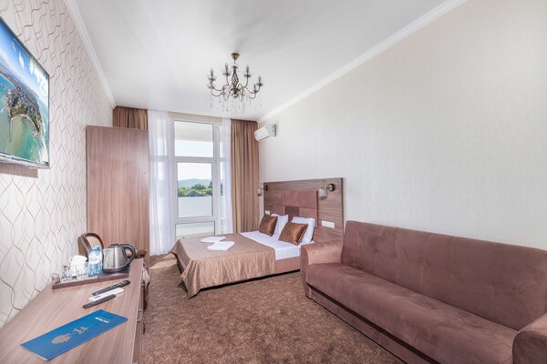 Самолетом до аэропорта г. Анапа, далее на маршрутном такси №113 до остановки «Автовокзал», далее на рейсовом автобусе №109 до остановки «Перекрёсток», далее пройти пешком 980 м до отеля.