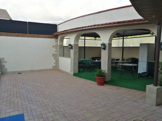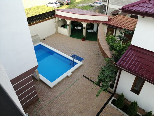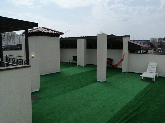 На территории гостевого дома расположен подогреваемый бассейн для приятного времяпрепровождения. Летняя кухня под навесом оснащена всем необходимым: плита, микроволновая печь, чайник, холодильник, посуда и столовые принадлежности. Во дворе вас ждет мангал для барбекю, детская площадка, батут, зона отдыха и эксплуатируемая крыша. Для вашего удобства предоставляются гладильная доска с утюгом, стиральная машина и стоянка для автомобилей.