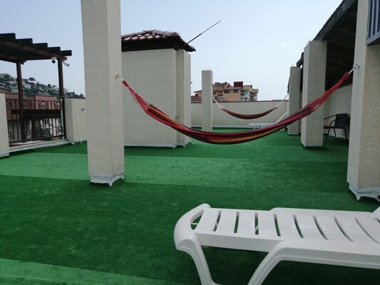 Трехэтажное здание предлагает просторные и светлые номера от 16 до 40 кв.м. Некоторые номера оснащены индивидуальными лоджиями. На первом этаже расположены два просторных номера (40 кв.м.) с удобными кухнями.