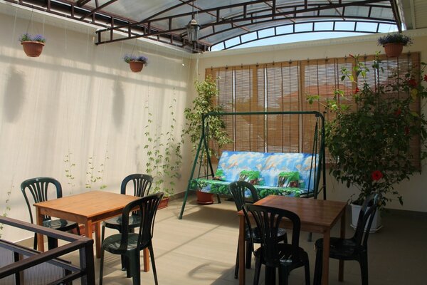 На втором этаже Гостевого дома оборудована терраса , где можно удобно расположится на диване, либо за столиками. Вечерами насладиться закатом и южным морским воздухом за бокалом вина