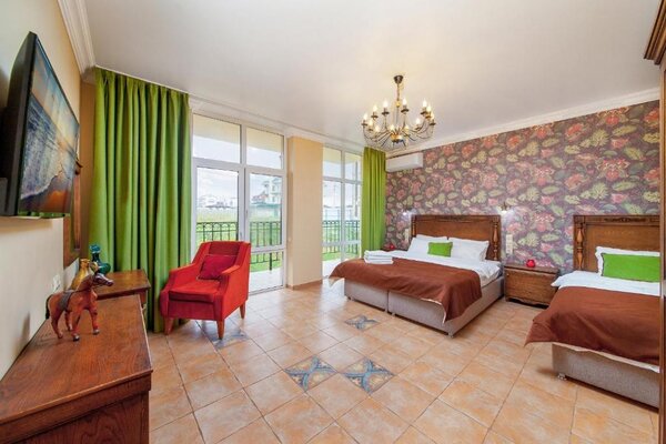 Отель находится в шаговой доступности от всех необходимых удобств: кафе, магазинов, караоке и аттракционов. Центр Анапы, аквапарк и парк развлечений доступны всего за 5-7 минут езды. Железнодорожный вокзал в Верхнем Джемете находится в 4 километрах, а до аэропорта Витязево можно добраться за 15 минут.