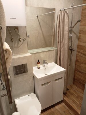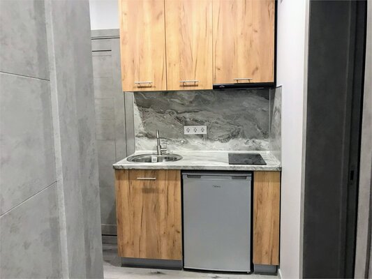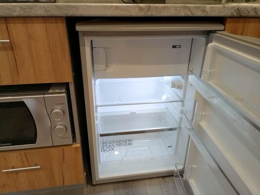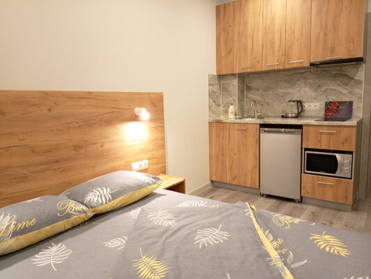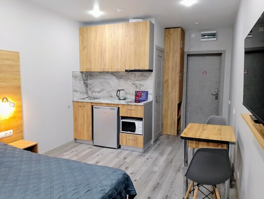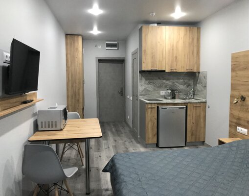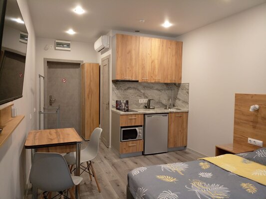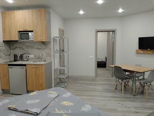 В каждом апартаменте собственная кухня с набором посуды, с встроенной электрической варочной поверхностью, есть микроволновая СВЧ печь, холодильник, электрический чайник.