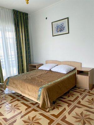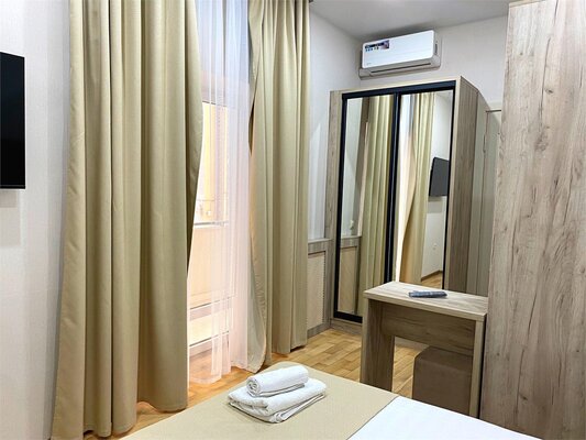 Гостевой дом находится в пятиэтажном здании на огороженной территории по улице Крымской. К услугам гостей однокомнатные и двухкомнатные номера различной вместимости и уровня комфорта. В каждом номере предусмотрены мебель, сплит-система, мини-холодильник, телевизор, Wi-Fi интернет и собственный санузел с душем. Некоторые номера дополнительно оснащены кухонной зоной и балконом.