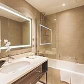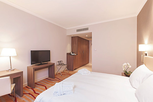Отель состоит из двух корпусов на 200 комнат. Номера открывают панорамные виды на горы и предлагают полное оснащение, соответствующее уровню четыре звезды.