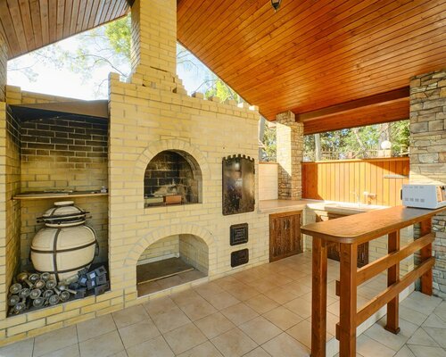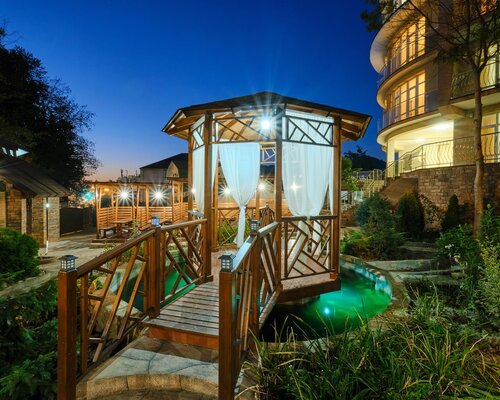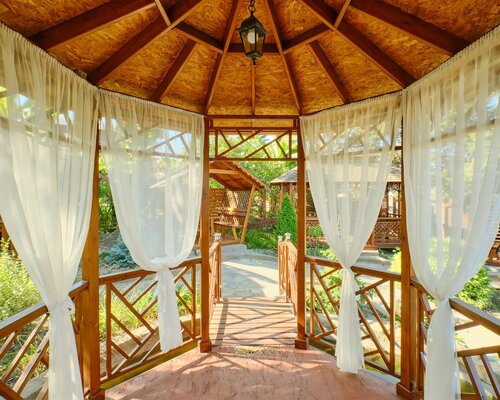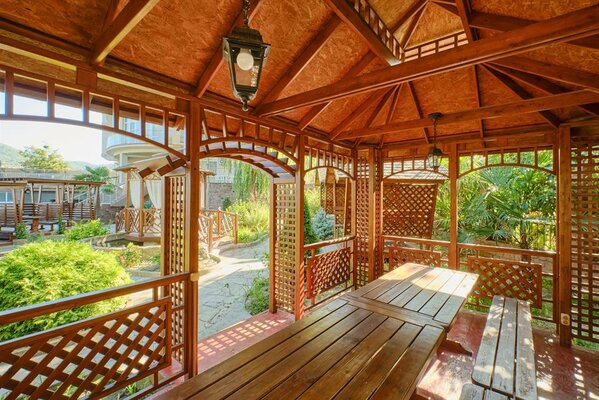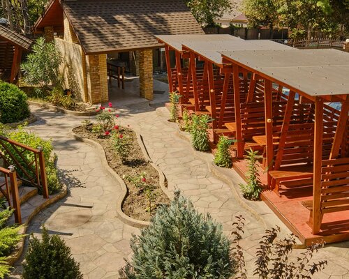 На территории комплекса есть кафе, зона для барбекю, банный комплекс с сауной, открытый бассейн и игровая площадка для детей. Также гости могут воспользоваться стиральной машиной и гладильной комнатой.