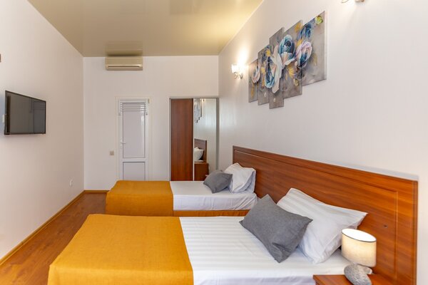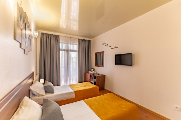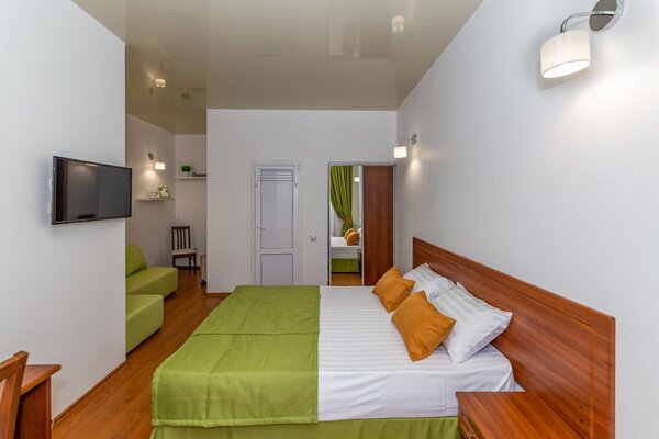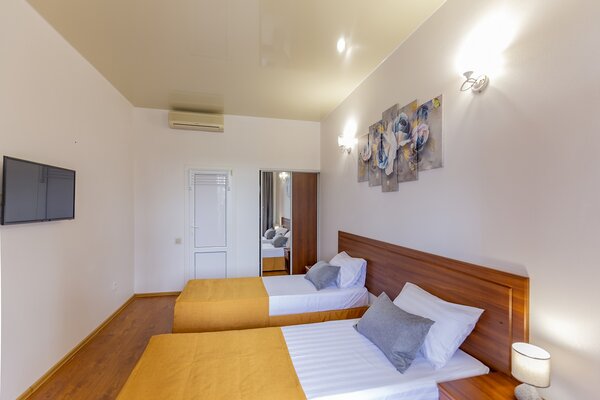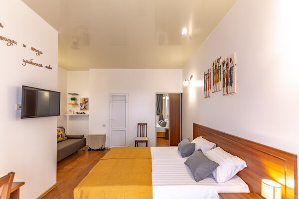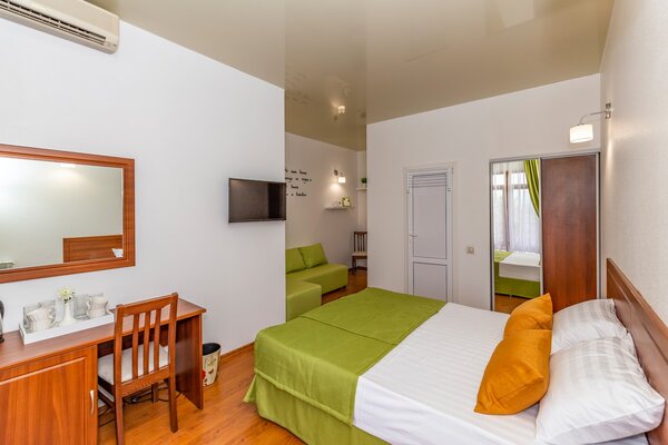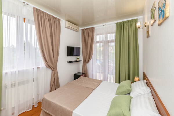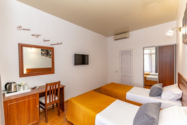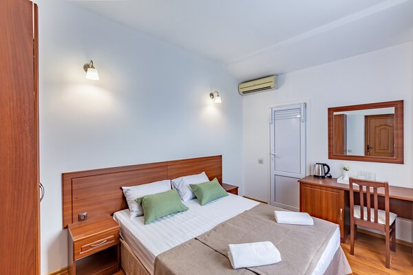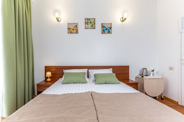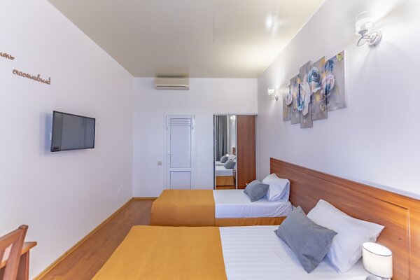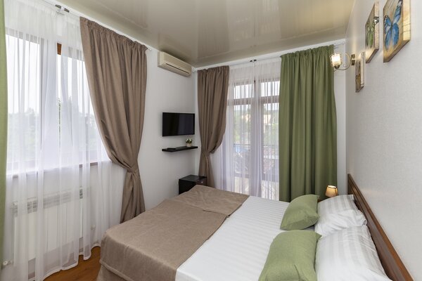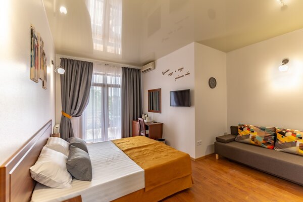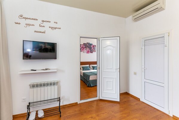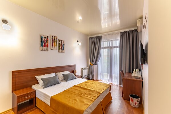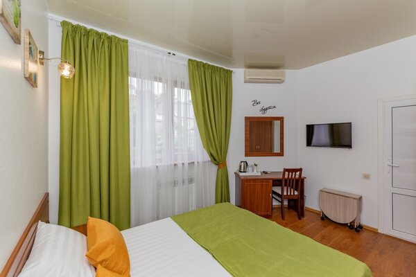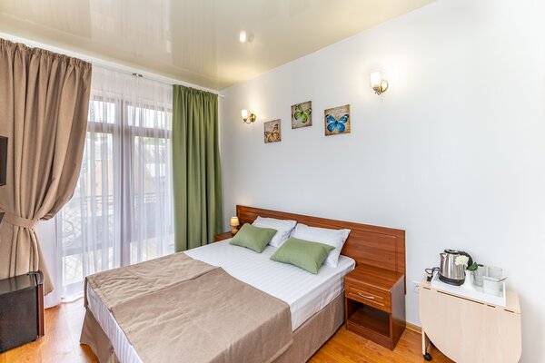 В номерах гостевого дома «Южный» созданы все условия для вашего комфорта: высокоскоростной Wi-Fi, спутниковое телевидение с функцией SMART TV, система кондиционирования и компактный холодильник. Плотные шторы блэкаут и соблюдение тишины в определенные часы гарантируют крепкий и спокойный сон. На просторной террасе с удобной мебелью вы сможете наслаждаться утренним кофе или погрузиться в чтение любимой книги под открытым небом.