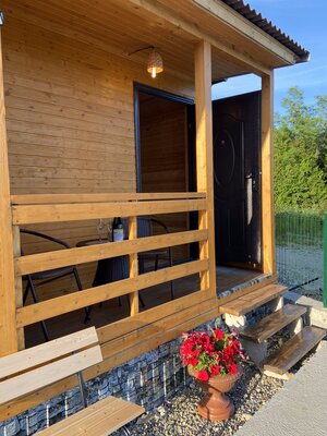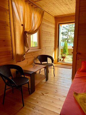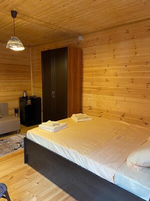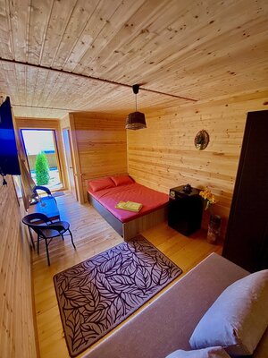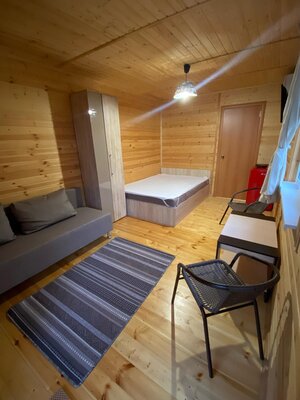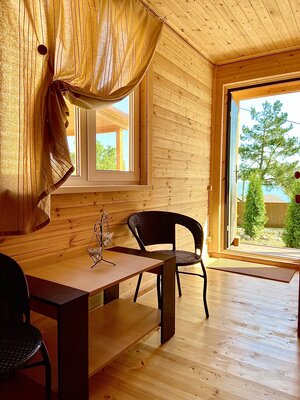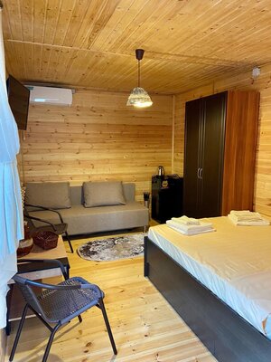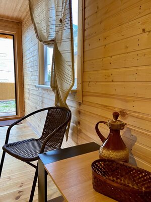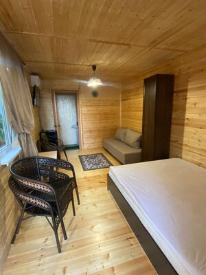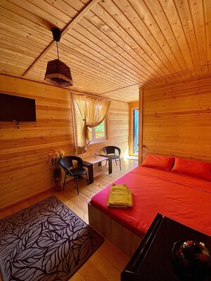 Гостям предлагаются уютные номера в главном здании, а также уютные деревянные домики с отдельными входами, которые вмещают две семьи. В каждом номере есть двуспальная кровать, раскладной диван, холодильник и собственная ванная комната. Дополнительно у домиков есть террасы с плетеной мебелью для приятного времяпровождения.