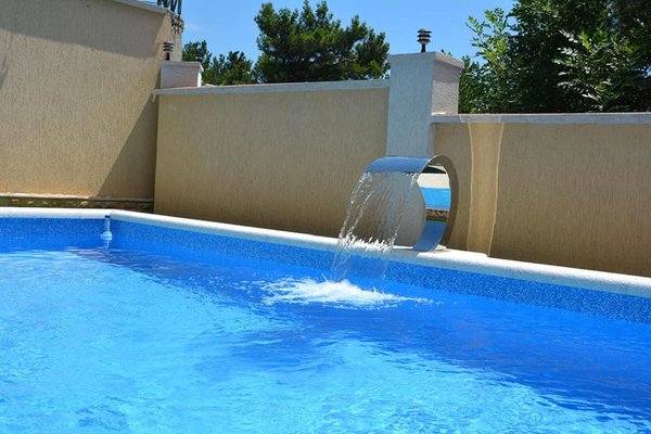 Открытый бассейн с шезлонгами и зоной отдыха.