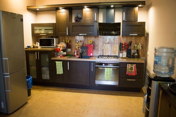 На территории гостевого дома есть кухня, которой может воспользоваться любой гость абсолютно бесплатно. Она оборудована всей необходимой посудой, холодильником, посудомоечной машиной. За дополнительную плату можно воспользоваться кофемашиной и заказать разливное пиво, а также заказать континентальный завтрак. Стоимость завтрака 300 рублей с человека, заказ принимается с вечера до 22:00.