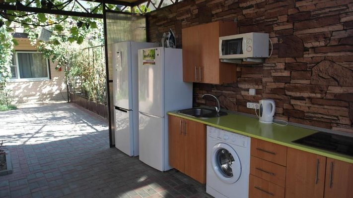В доме есть две общие кухни. Одна из них на уличной террасе под навесом. Здесь в распоряжении гостей вся кухонная техника и утварь, а также посуда и столовые приборы.
