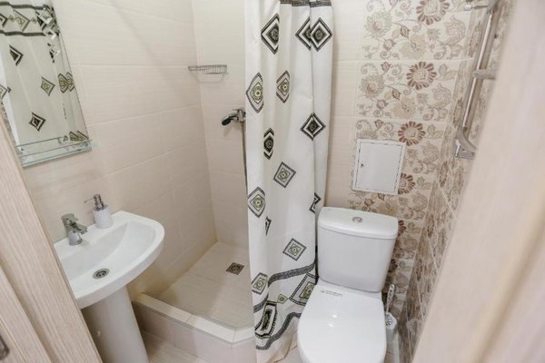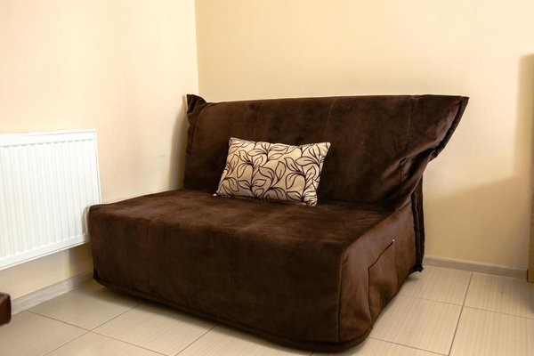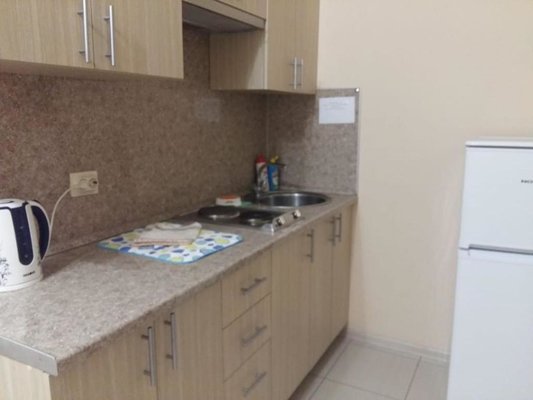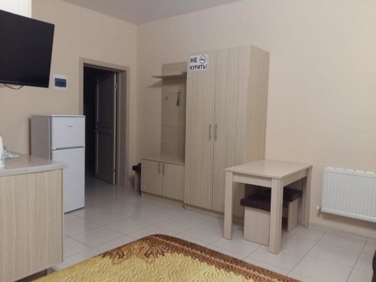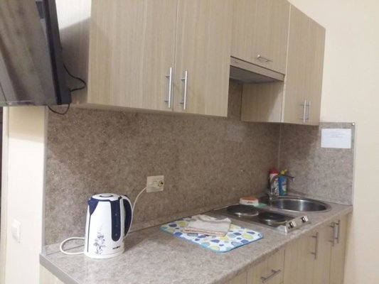 В гостевом доме оборудована общая кухня, где можно приготовить еду самостоятельно. Имеется плита, холодильник, гарнитур и большой обеденный стол. До продуктового магазина можно дойти пешком за пару минут.
