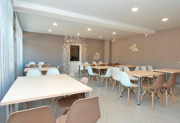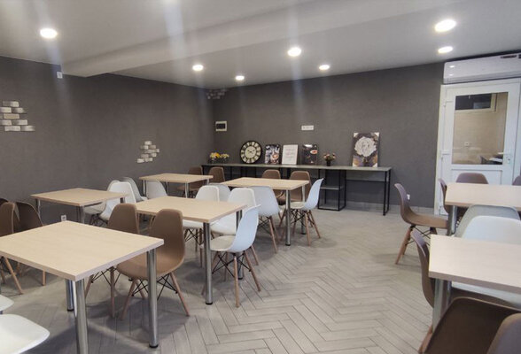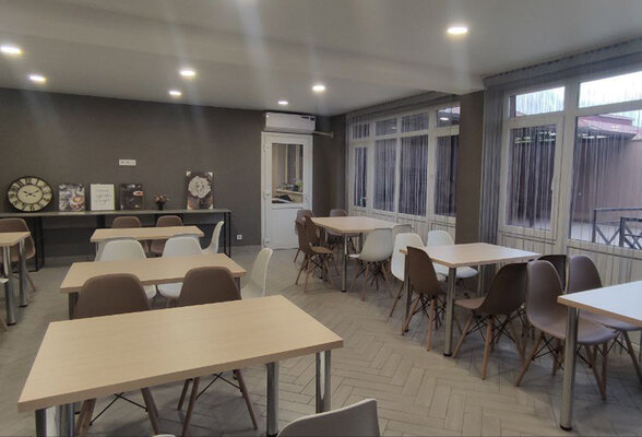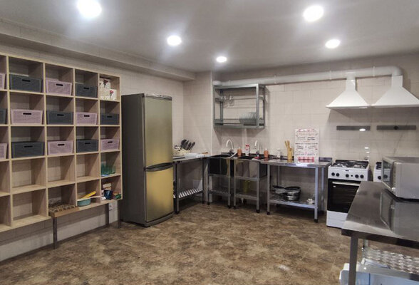На первом этаже расположена кухня для самостоятельного приготовления пищи. Просторный зал со столиками, для комфортного пребывания в жаркое время года оборудован кондиционером.