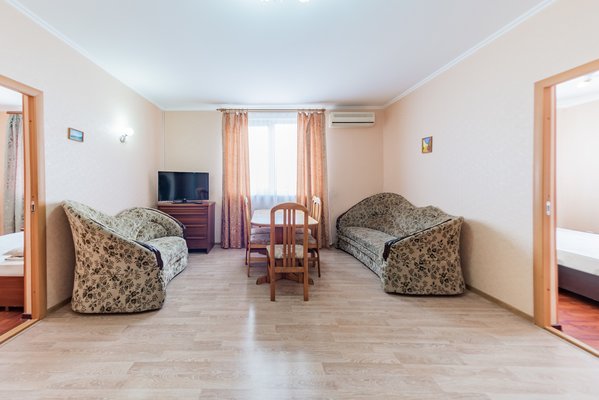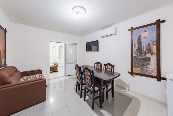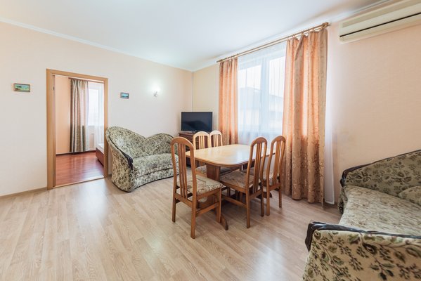 Из номеров открывается великолепный вид на побережье, так как апартаменты расположены на первой линии Черного моря. В каждом номере есть отдельная ванная комната с душем. В номерах есть двуспальные кровати и удобная мебель. Также предоставляются полотенца и халаты.