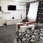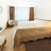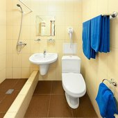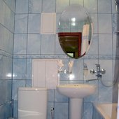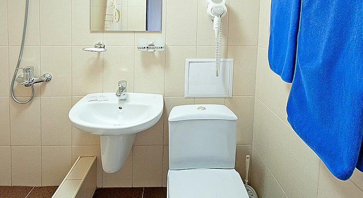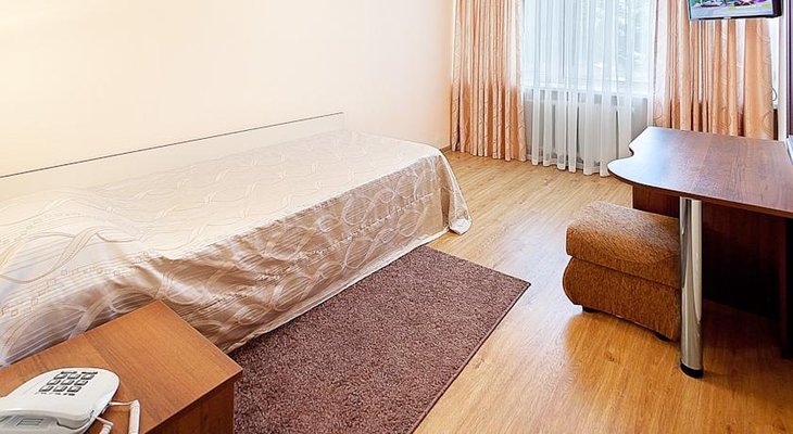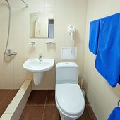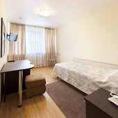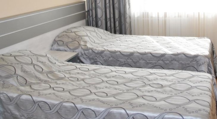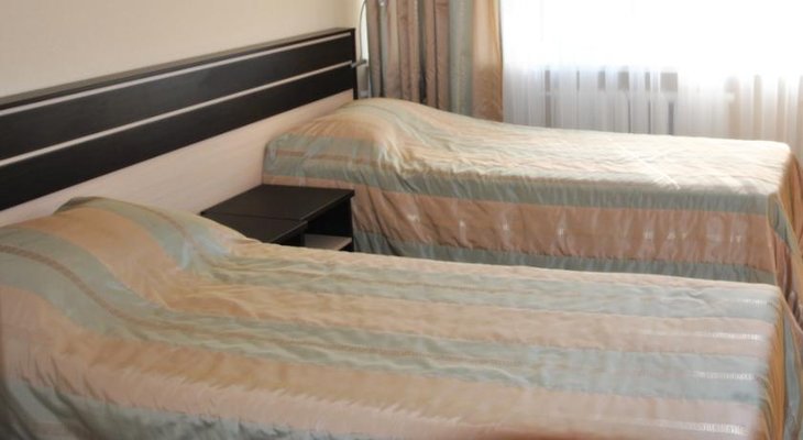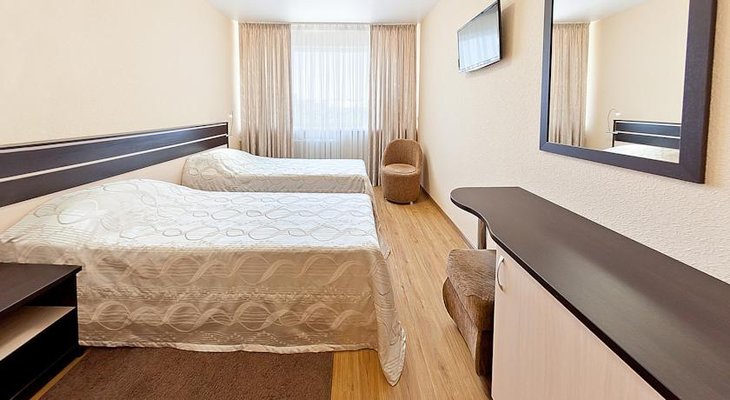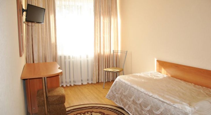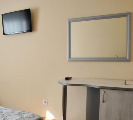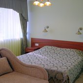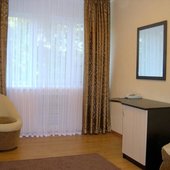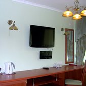 Светлые номера с кондиционером оформлены в теплых тонах и классическом стиле. В каждом из них есть телевизор с плоским экраном, холодильник и собственная ванная комната.